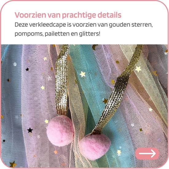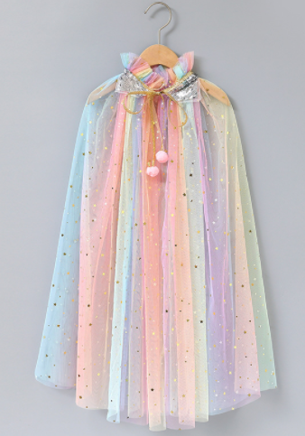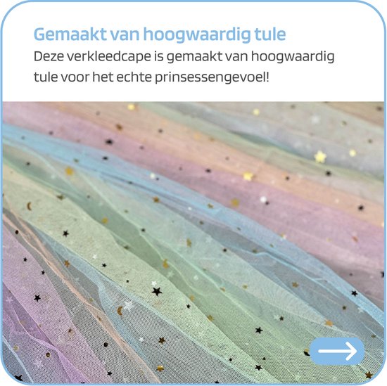 Vind jouw kind prinsessen speelgoed ook helemaal geweldig? Dan is deze prinses cape in regenboog / pastel tinten perfect voor eindeloos speelplezier! De cape is zeer comfortabel en makkelijk om te doen. Met deze kleurige unicorn speelgoed tule prinses mantel kan je kind rollenspellen spelen in de fantasiewereld van prinsessen.