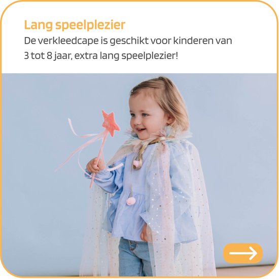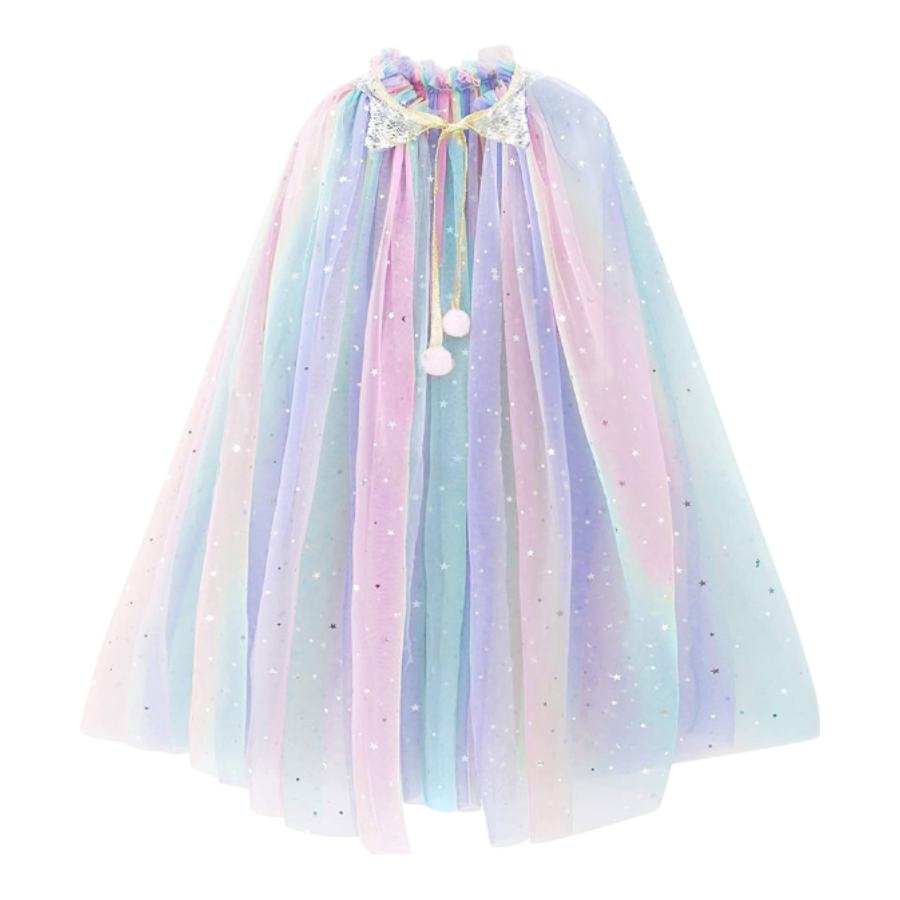 De unicorn prinsessenjurk is gemaakt van mooie tule stof in zachte pasteltinten en voorzien van glitters in de kraag en goudkleurige sterren pailletten over de gehele cape. De prinses cape heeft 1 maat en is daarmee geschikt voor kinderen van 3 tot 8 jaar. Door het design valt de cape zacht en soepel. De luchtige, zachte tule cape glinstert door de vele zilveren en gouden sterren en maantjes.De verkleedcape is geschikt voor kinderen van 3 tot 8 jaar, wat zorgt voor extra lang speelplezier