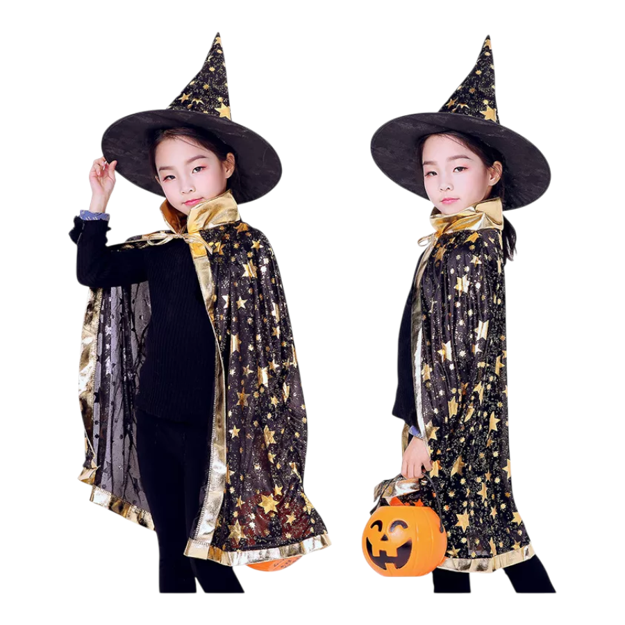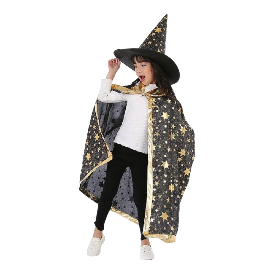 Vindt jouw kind tovenaars, Harrie Potter en heksen ook helemaal geweldig? Dan is deze cape met hoed perfect voor eindeloos speelplezier! De Jobber tovenaar cape in zwart is een fantastische toevoeging aan de verkleedkist van elk kind. Met een glanzende gouden kraag en goudkleurige sterren is deze cape net zo betoverend als de wereld van magie zelf.